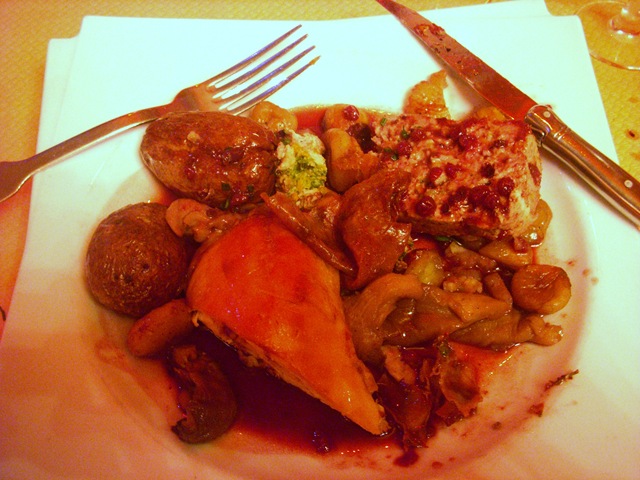We mingled and had drinks for a while then everyone found a seat and we enjoyed a 15 minute welcome speech from Mr. de Beranger, the program director. We had our appetizer of baguette with black olives and roasted red peppers (not all that exciting) then the not-so-American main course of turkey (obviously), cranberry sauce (which was actually sauce), “stuffing” (I will not claim to know what was in this, but I stand by my opinion that it tasted like fish), potatos and some chesnuts and mushrooms. The turkey and its sauce was pretty good, the rest wasn’t too bad either, except that stuffing loaf…
