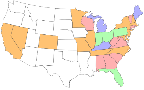 Blue for states you’ve spent a lot of time in or seen a fair amount of.